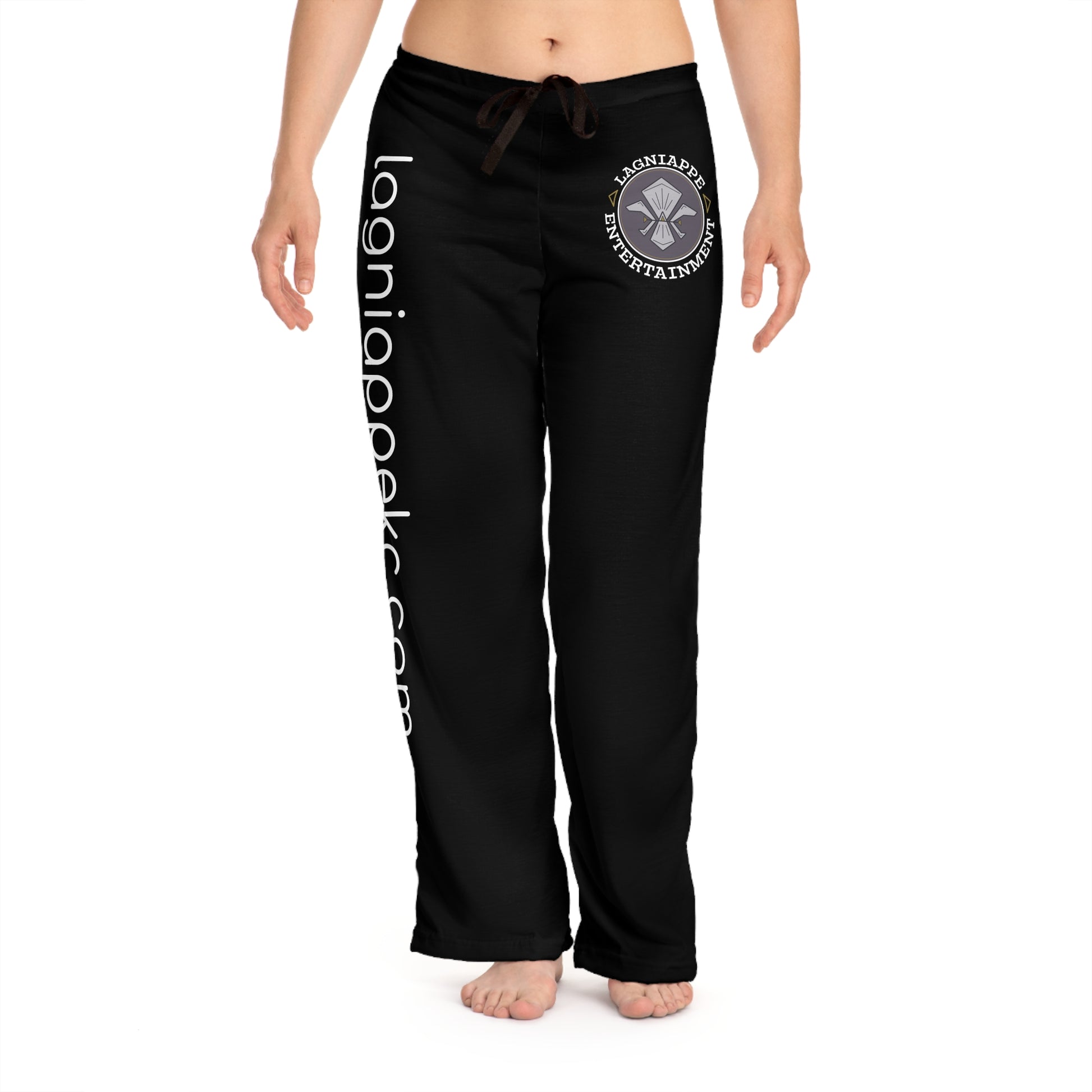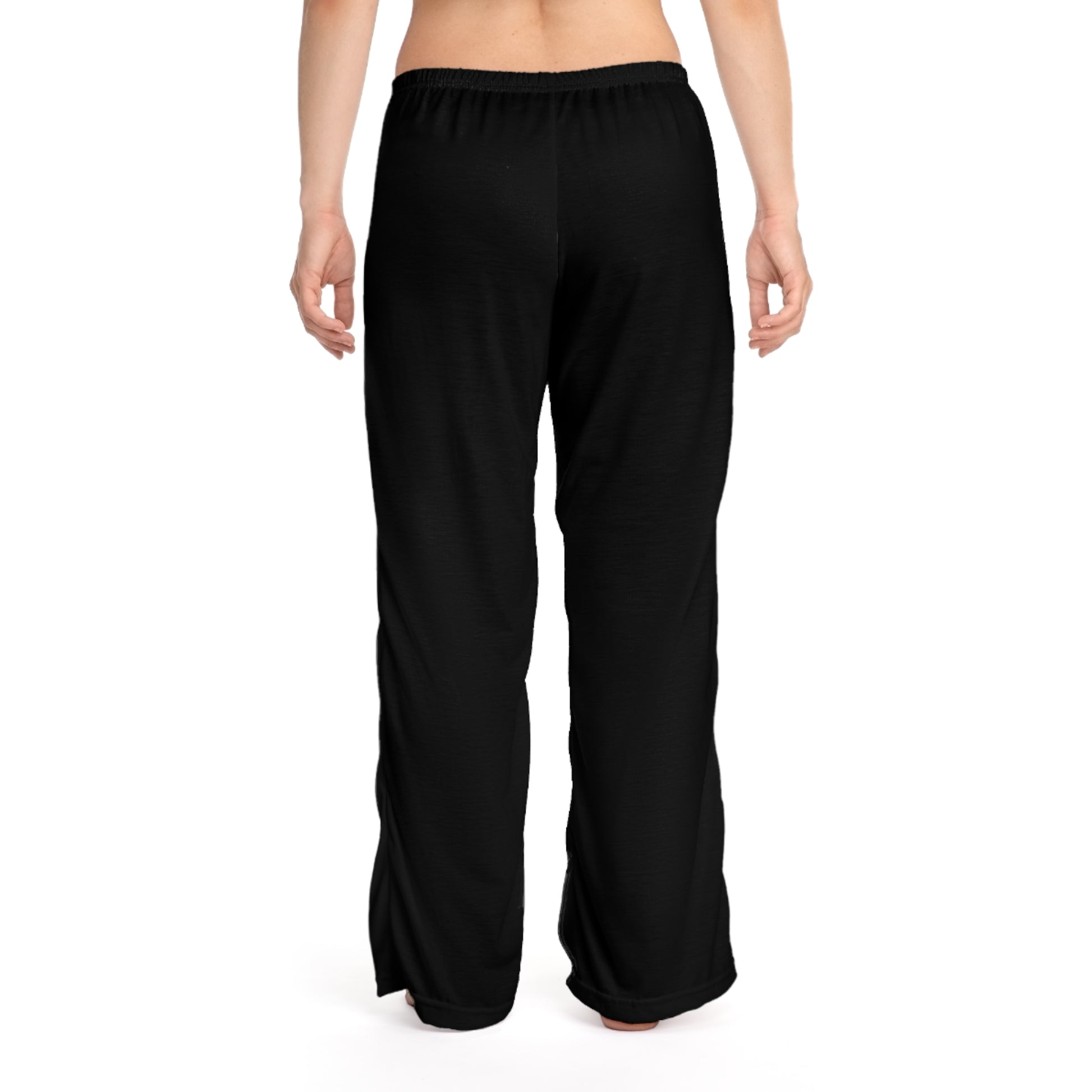 Slide into quiet comfort with these relaxed pajama pants made for late-night browsing and slow Sunday mornings. The soft, lightweight polyester drapes smoothly and keeps printed detail crisp — a subtle statement in deep black with a vertical web address and small emblem at the hip. The elastic back and flat black drawstring let you tune the fit without fuss. Wear them for low-light studio sessions, working from home, or those evenings when you want to feel put-together while staying completely comfortable.