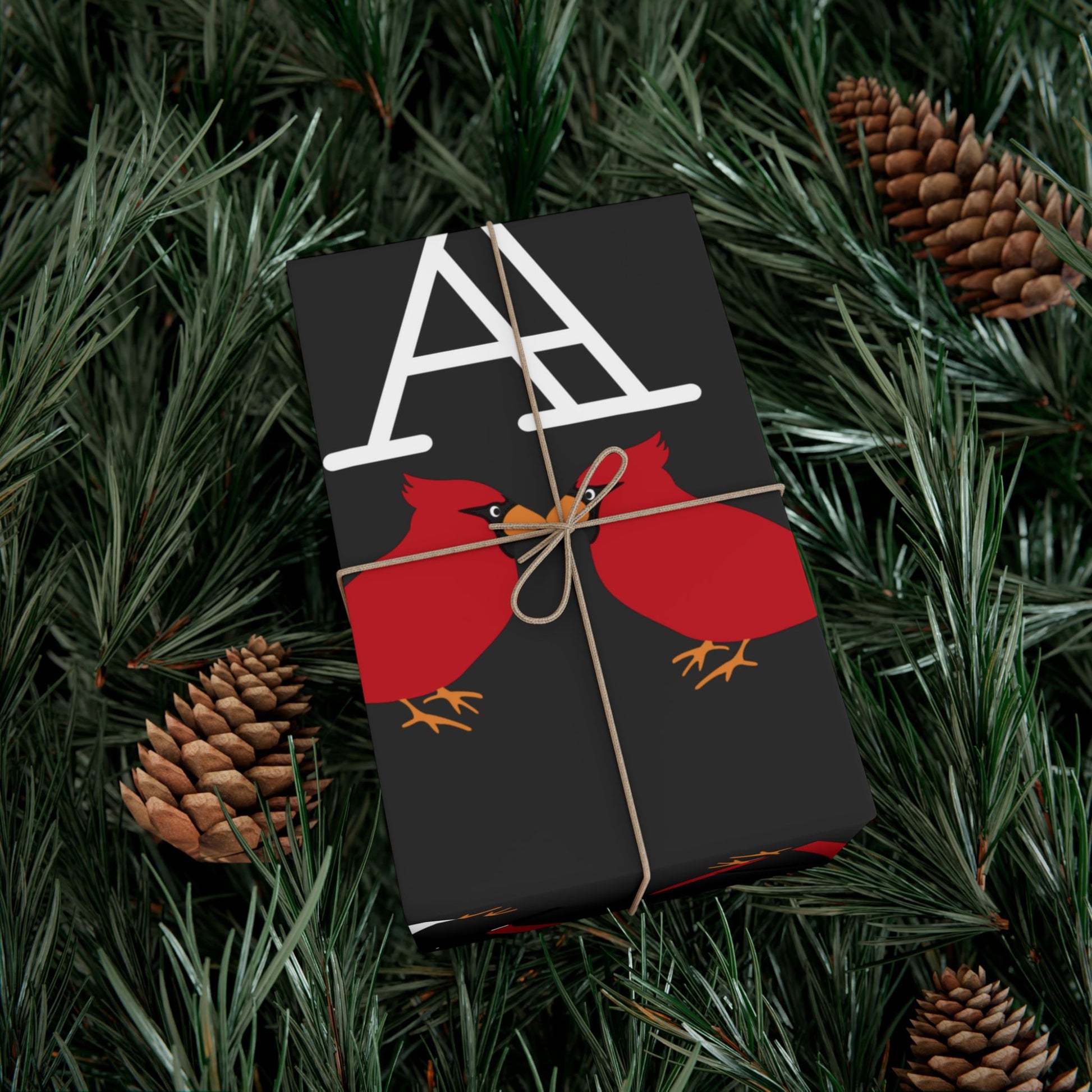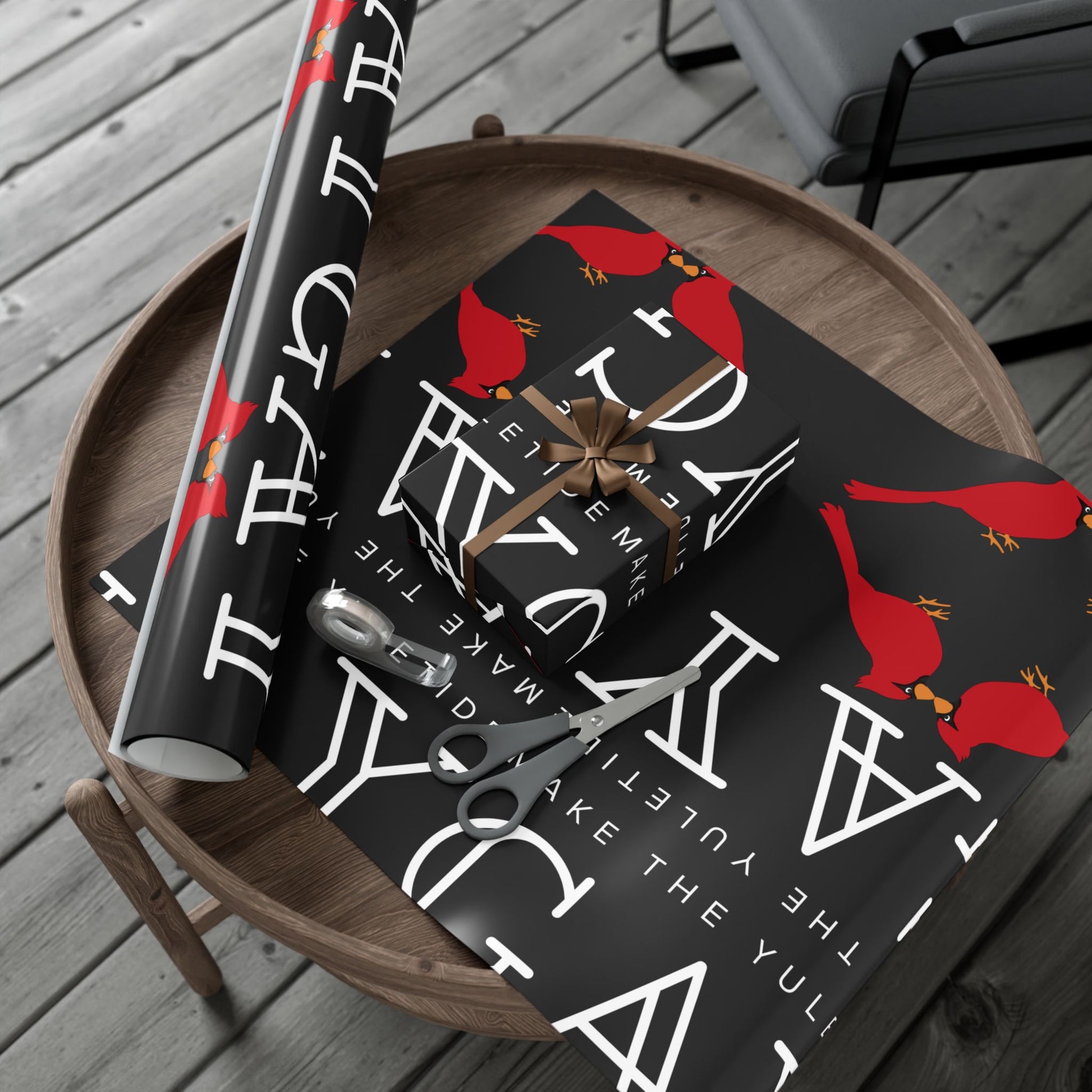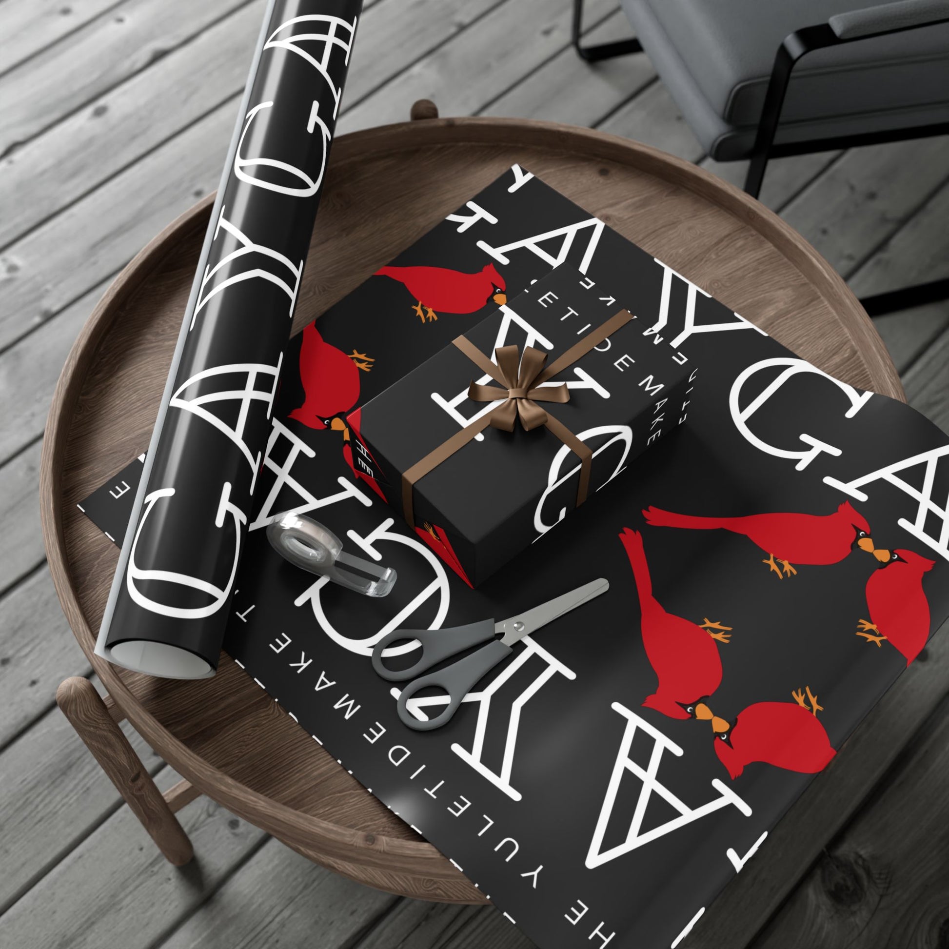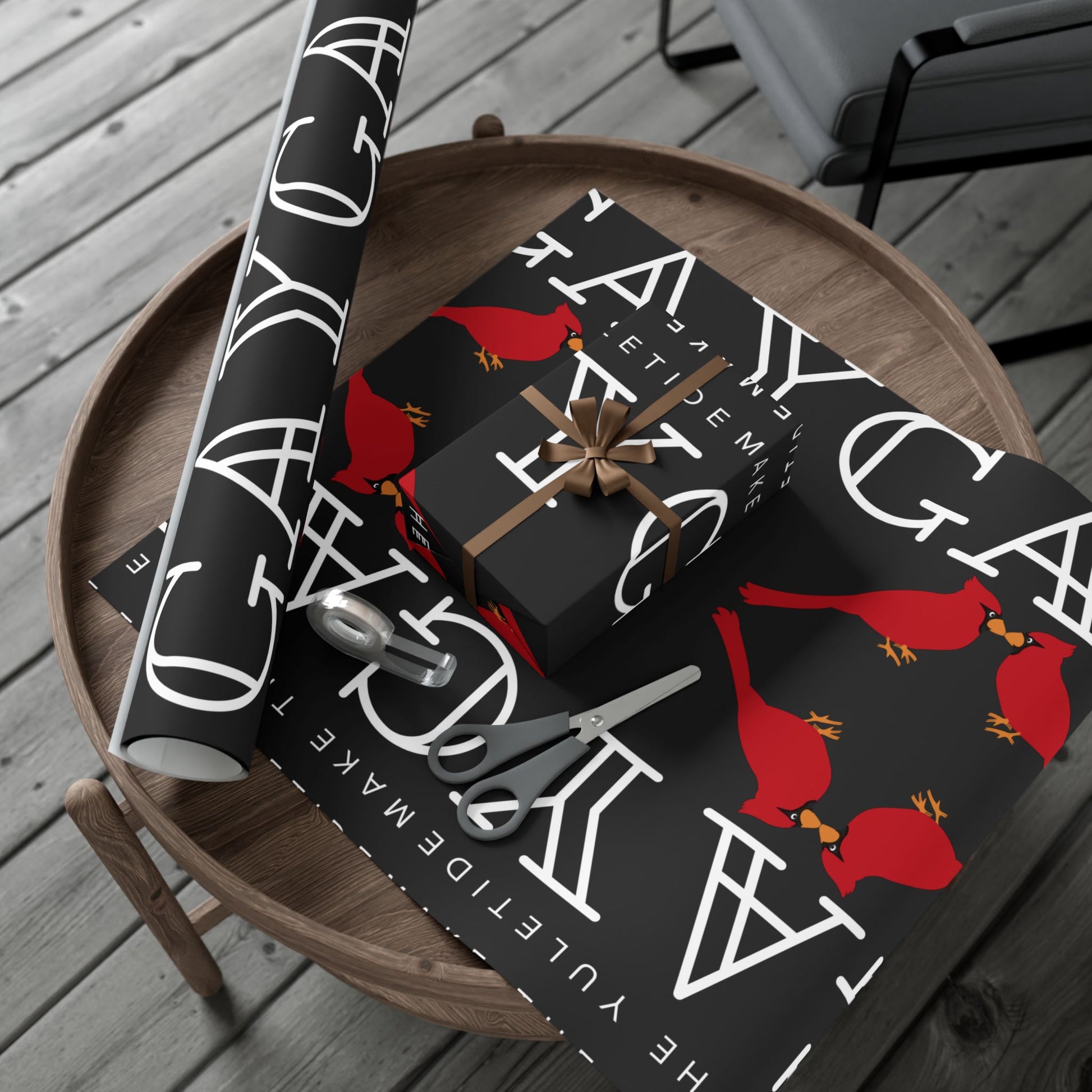 Black gift wrap printed with repeating white lettering and bright red cardinals. The bold, modern layout balances negative space with pops of color — glossy satin or refined matte finishes let the reds sing against deep charcoal. The paper feels sturdy and flexible as you wrap, resisting tears and creases while staying smooth to the touch. Environmentally mindful: water-based GreenGuard UL Certified inks and fully recyclable paper mean presents look joyful without extra waste. Use the smaller sheets for jewelry boxes and books, or larger sizes for framed prints and holiday bundles.