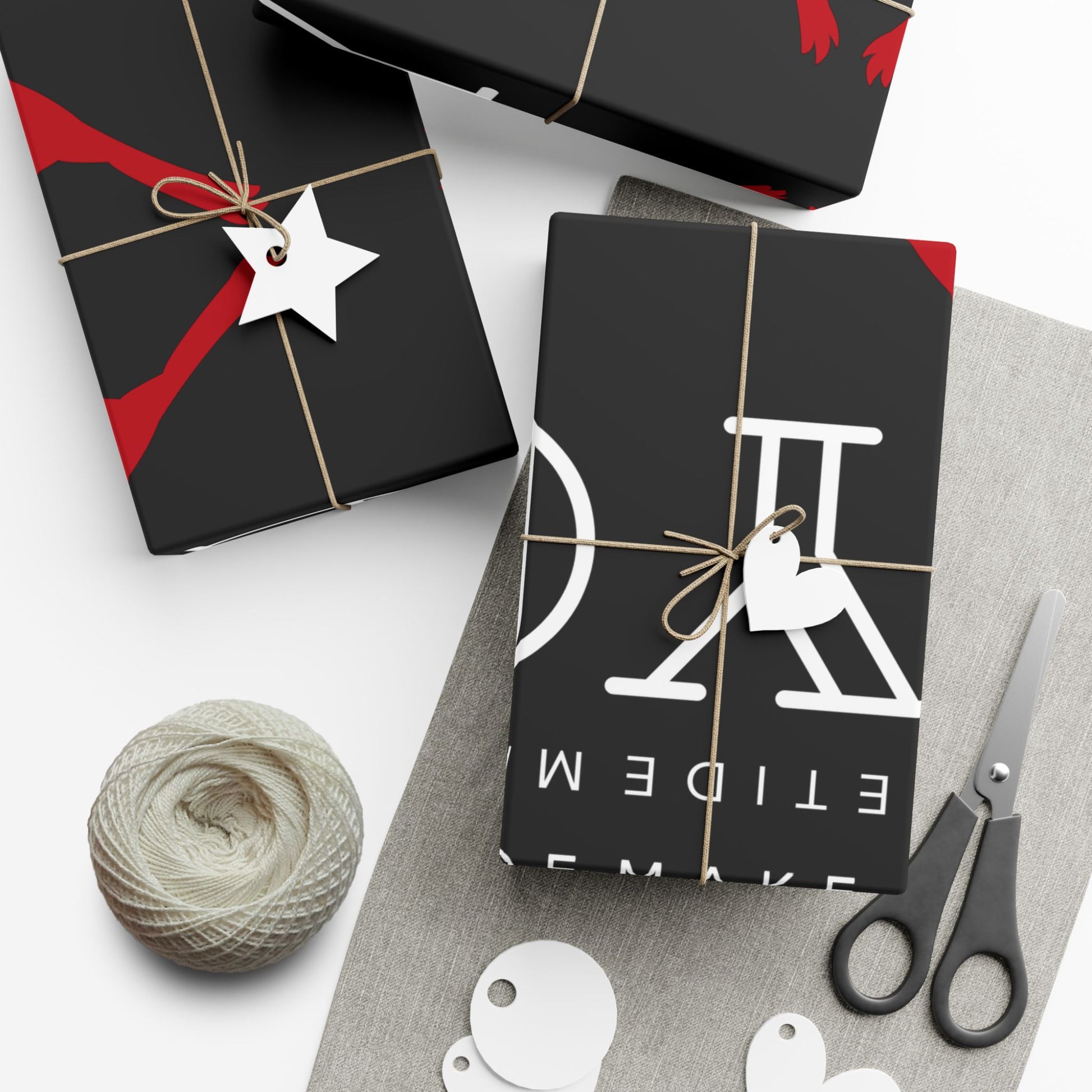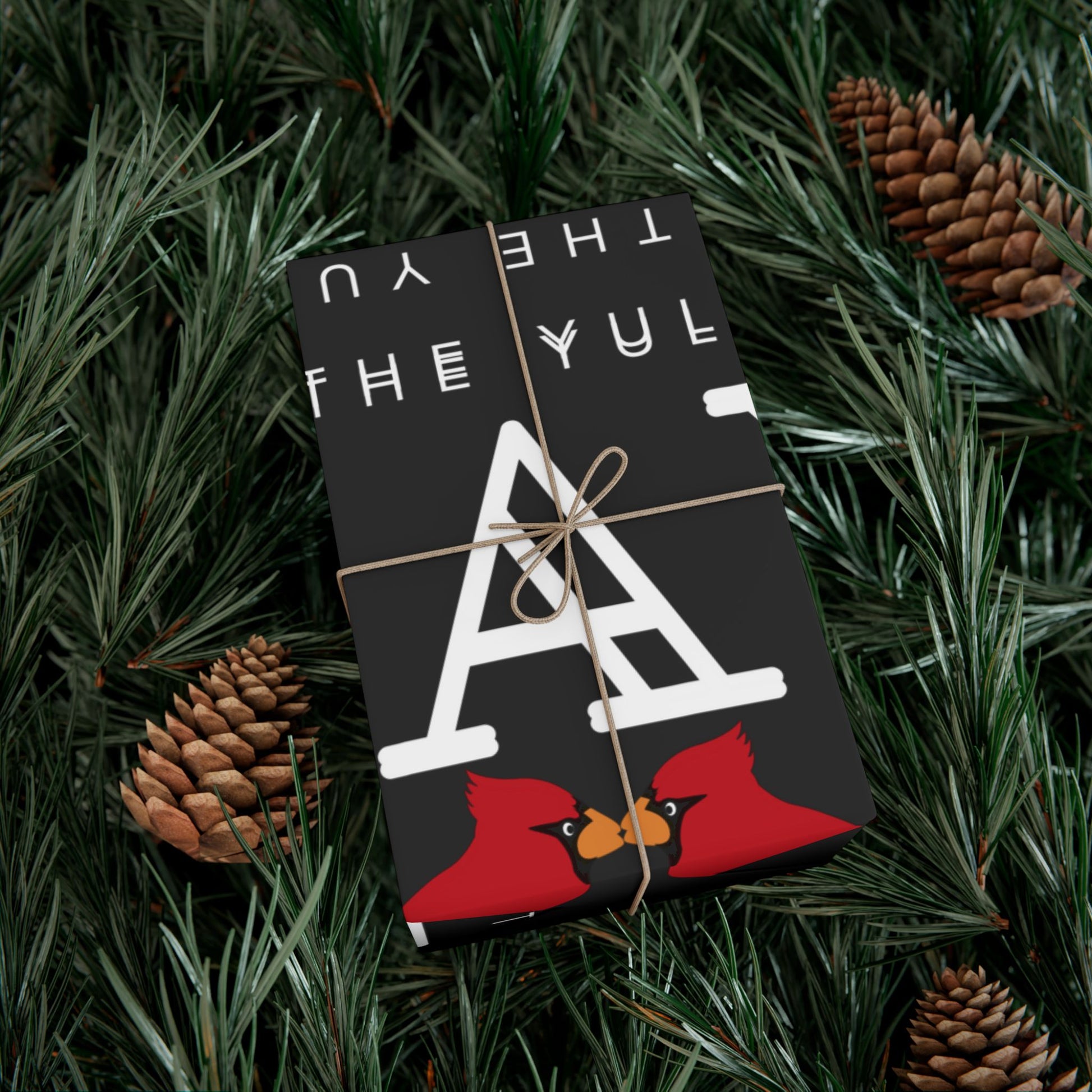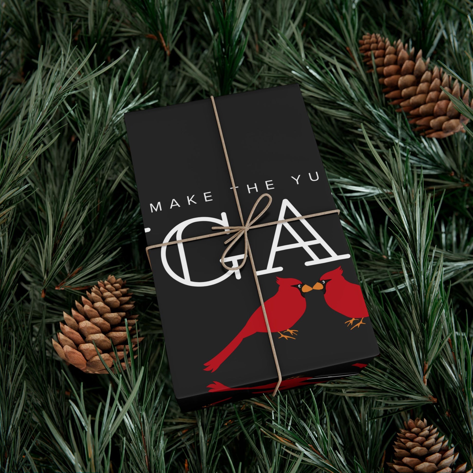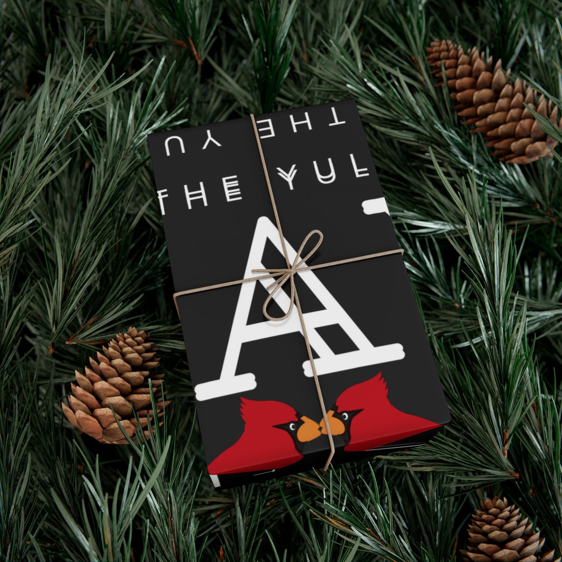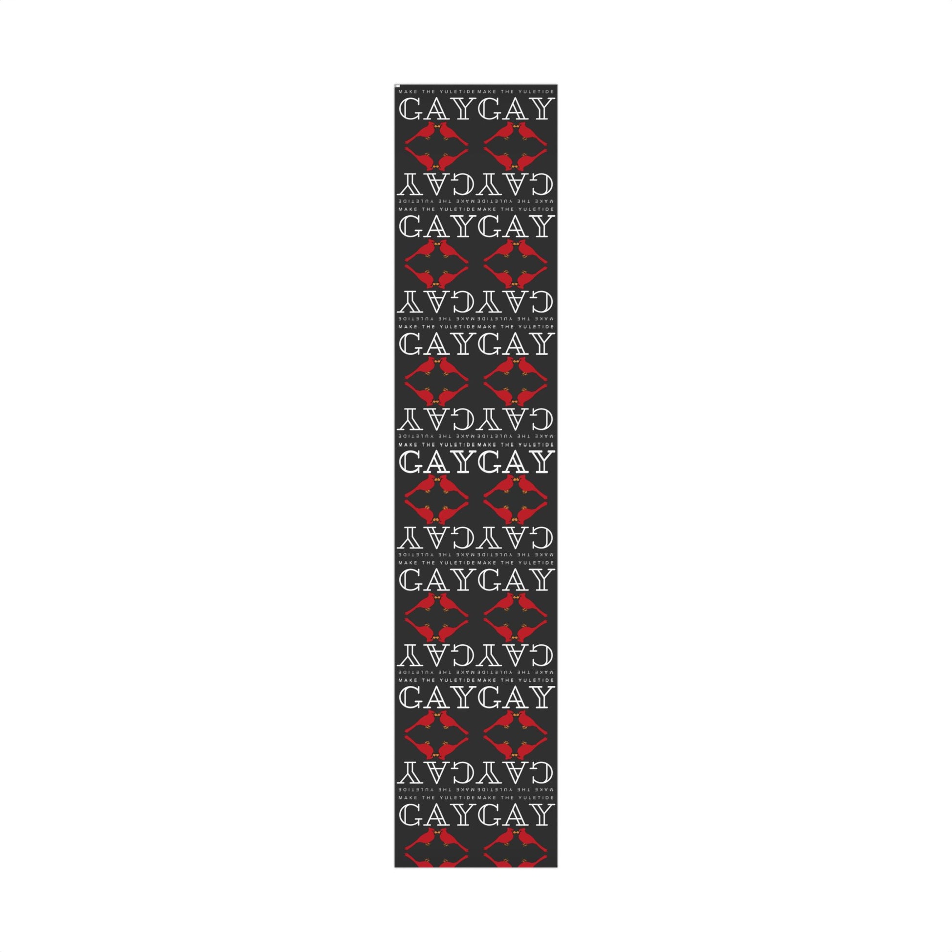 Black gift wrap printed with repeating white lettering and bright red cardinals. The bold, modern layout balances negative space with pops of color — glossy satin or refined matte finishes let the reds sing against deep charcoal. The paper feels sturdy and flexible as you wrap, resisting tears and creases while staying smooth to the touch. Environmentally mindful: water-based GreenGuard UL Certified inks and fully recyclable paper mean presents look joyful without extra waste. Use the smaller sheets for jewelry boxes and books, or larger sizes for framed prints and holiday bundles.